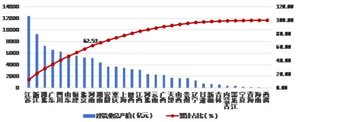 跨省完成建筑業(yè)總產值排名前兩位的是江蘇和北京,分別為 5430.59 億元和 3774.95億元。兩省跨省產值之和占全部跨省產值的比重為 26.87%。浙江、湖北、福建、上海、廣東、湖南、四川、河南、山東、陜西和江西11個地區(qū),跨省完成的建筑業(yè)總產值均超過 1000 億元。