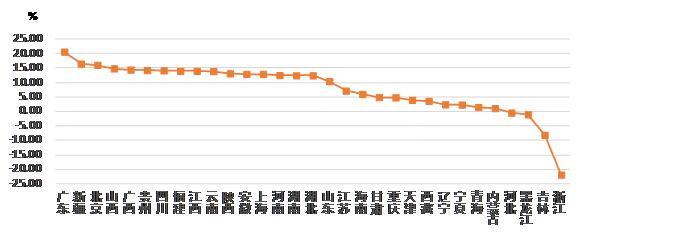 從各地區(qū)建筑業(yè)總產值增長情況看,有 27 個地區(qū)的建筑業(yè)總產值較上年同期有不同幅度的增長。其中,廣東、新疆、北京的增幅均超過 15%。有 4個地區(qū)出現負增長,其中,浙江出現了 超過20% 的負增長(圖 2)。