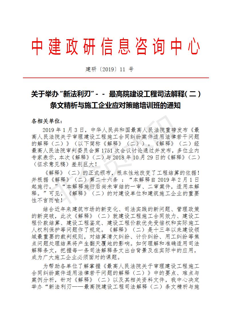 關(guān)于舉辦“新法利刃”—最高院建設(shè)工程司法解釋(二) 條文精析與施工企業(yè)應(yīng)對(duì)策略培訓(xùn)班的通知